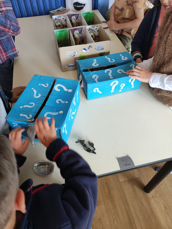 Par le toucher, les élèves s'approprient les différentes espèces du Golfe du Morbihan en cherchant des objets dans une boîte mystère. Au fur et à mesure, ils comprennent la différence entre les animaux, les végétaux et les minéraux, ce qui les caractérise ainsi que les besoins des êtres vivants. Les élèves repartent avec leur petit livret reprenant ce qui a été fait dans l'atelier.